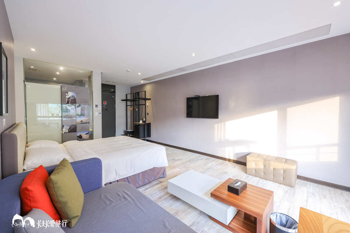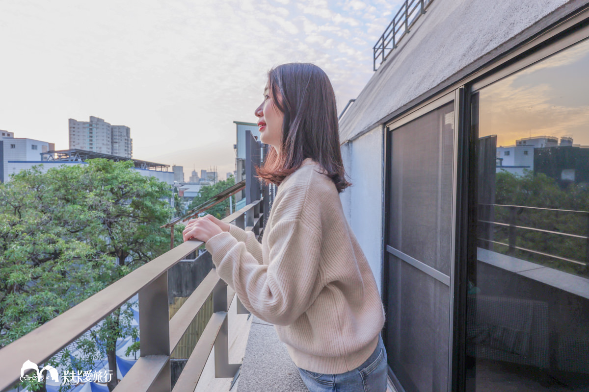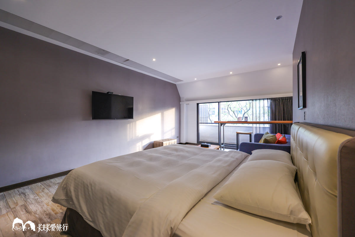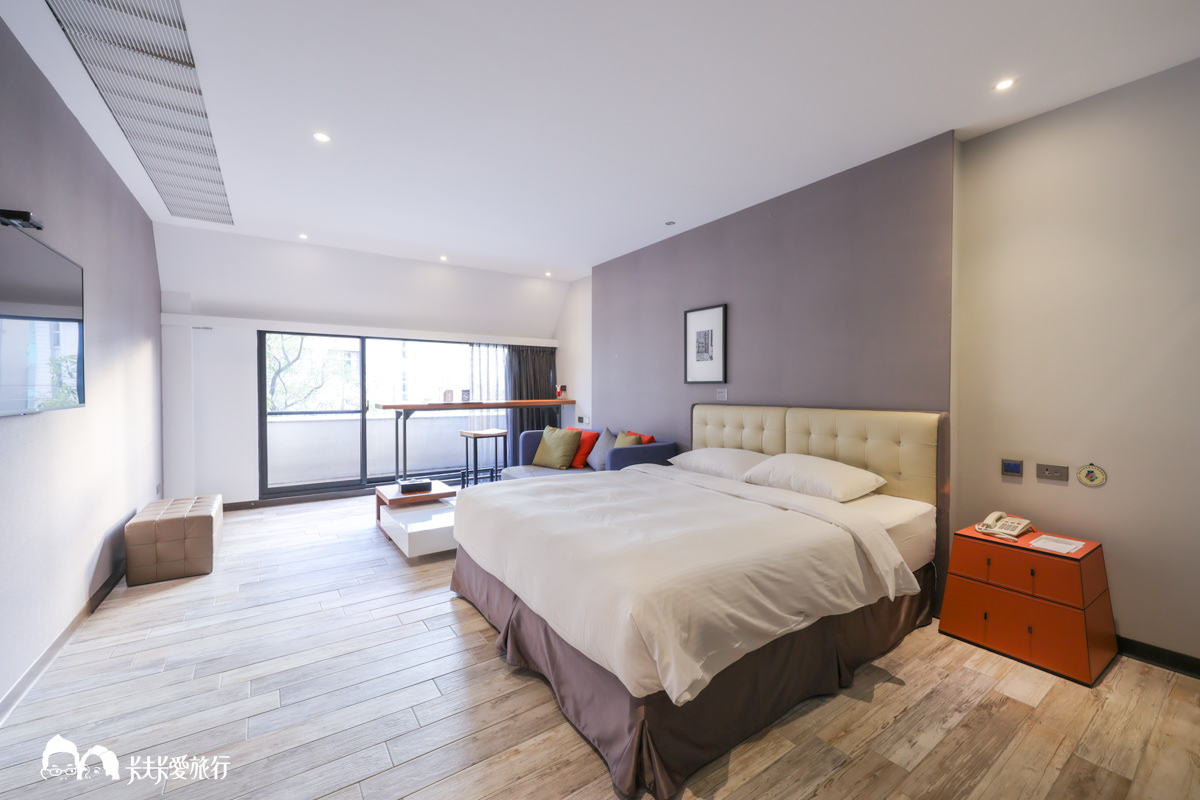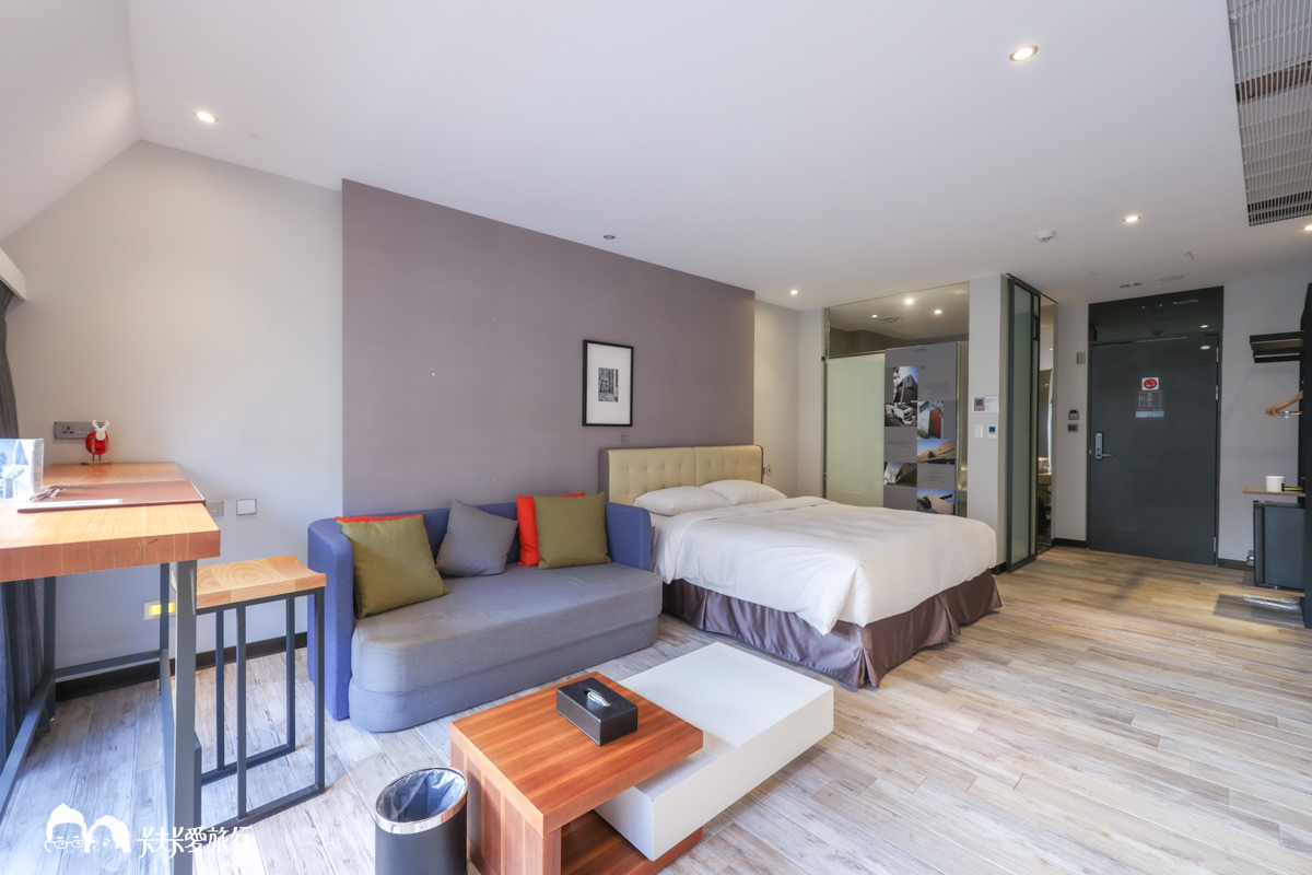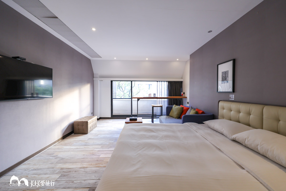 開箱完我們的房間,來看看隔壁友人入住的天步VIP房,一樣是以日治時期的元素設計,相較天步藝術房的坪數更大一些,大約有15坪左右,一樣有自己的獨立陽台,也有很好的採光,不過在整體用色上更顯活潑與現代感一些