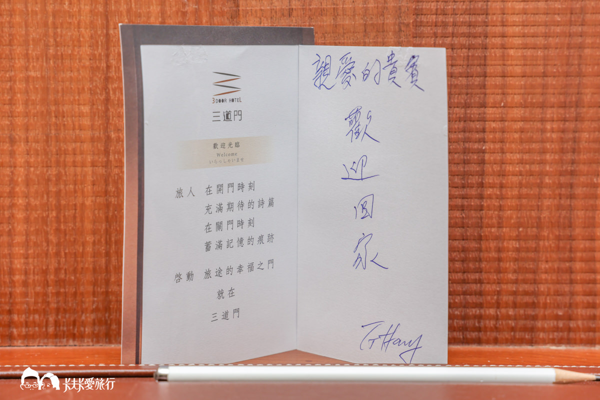 貼心的管家附上的小卡片,寫著「歡迎回家」,手寫的文字充滿溫度,雖然看似沒什麼的小舉動,但確實擄獲了我們的心,領到房卡後,跟著管家上樓看看樓層的特別設計,開箱今晚入住的房間吧