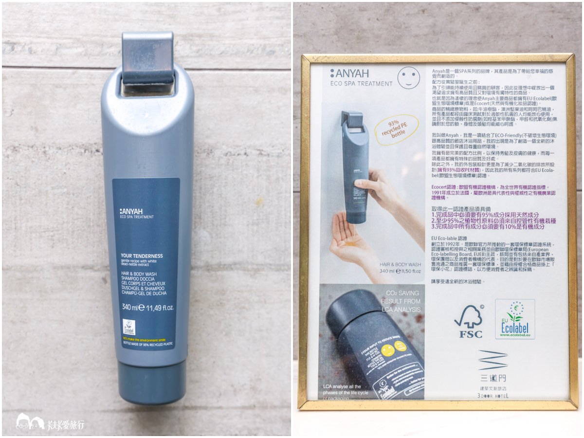 沐浴用品是用歐盟認証天然BIO不回填的義大利品牌「ANYAH」,內容物都是萃取自天然植物,洗頭沐浴一次搞定,頭一次看見的品牌引起我們的好奇,裡頭是白色野麻花的成分,很少見的草本植物,洗起來肌膚保濕不刺激,會帶點像是薄荷的淡淡香氣