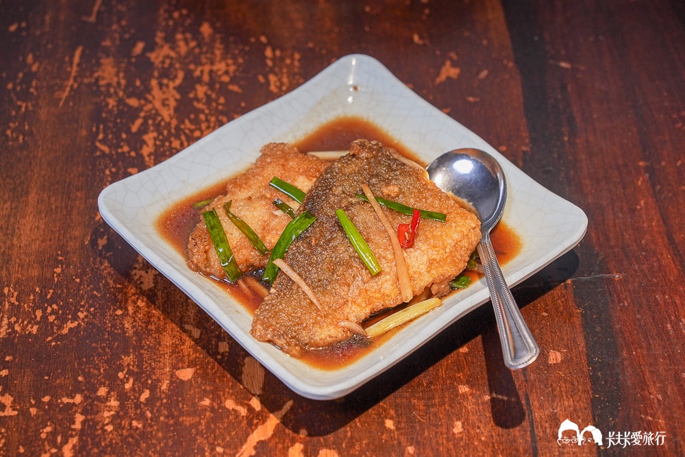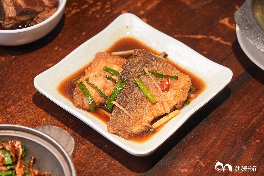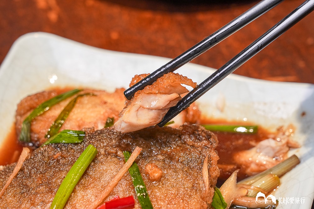 這道紅燒海鱸魚也是必點,魚先煎過再紅燒,外皮帶點酥香,吸附了醬汁後更有層次,醬汁鹹香中帶點微甜,搭配薑絲、蔥段和辣椒,吃起來開胃又下飯