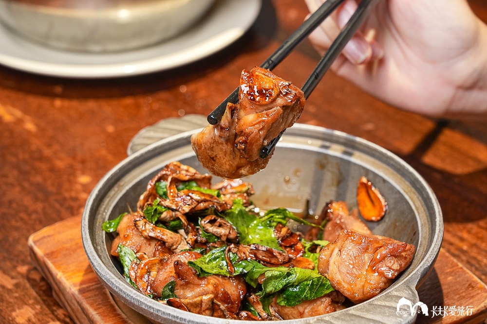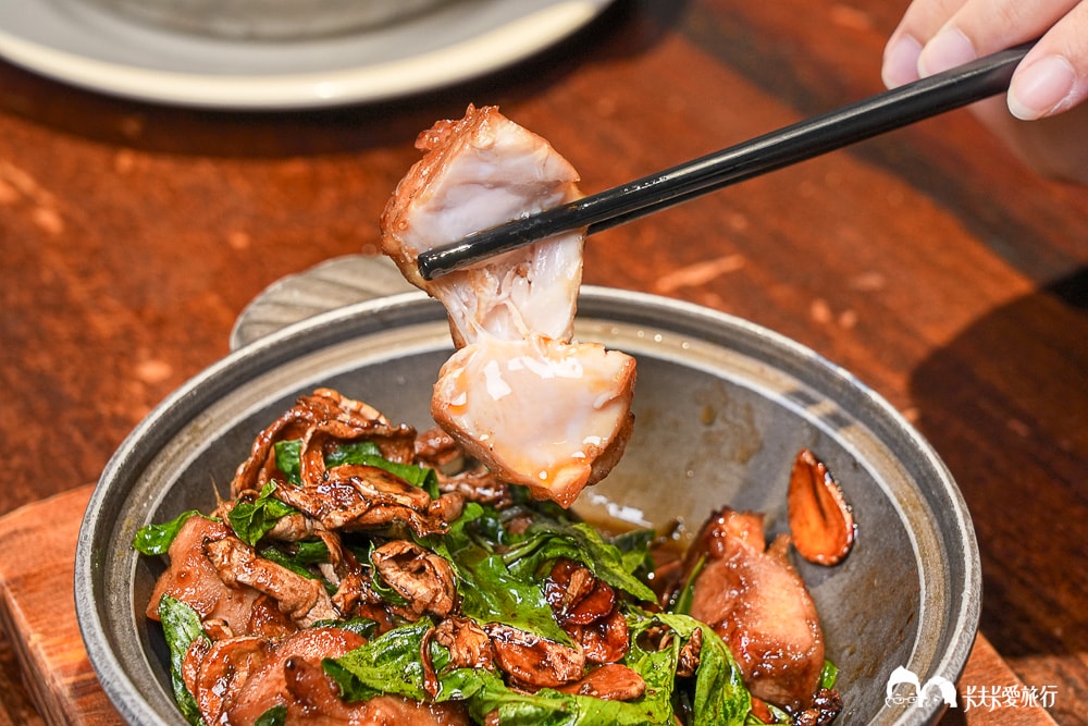 喫飯食堂的三杯雞一上桌,香氣立刻撲鼻而來,熱騰騰的鐵鍋裡,雞肉塊被炒得油亮焦香,搭配蒜頭、薑片和九層塔,醬汁收得剛剛好