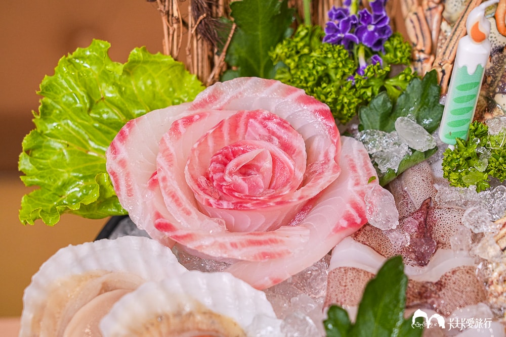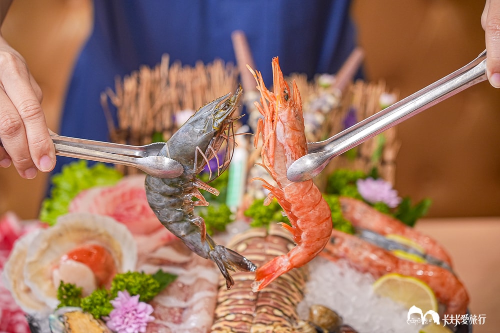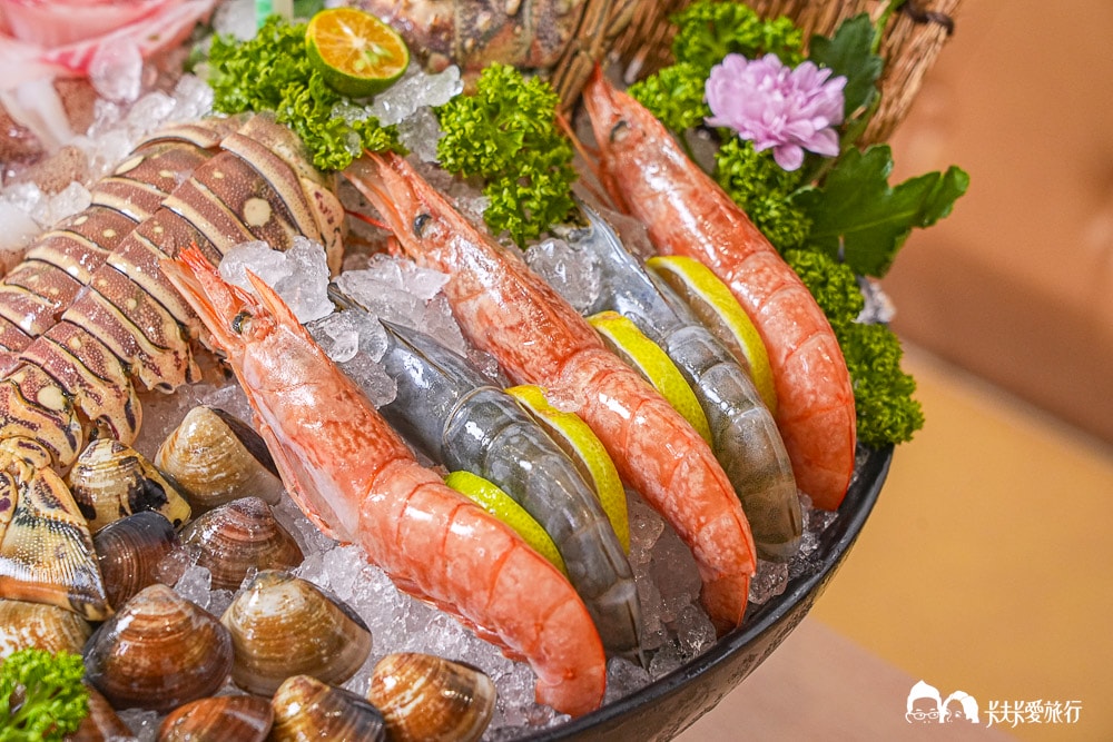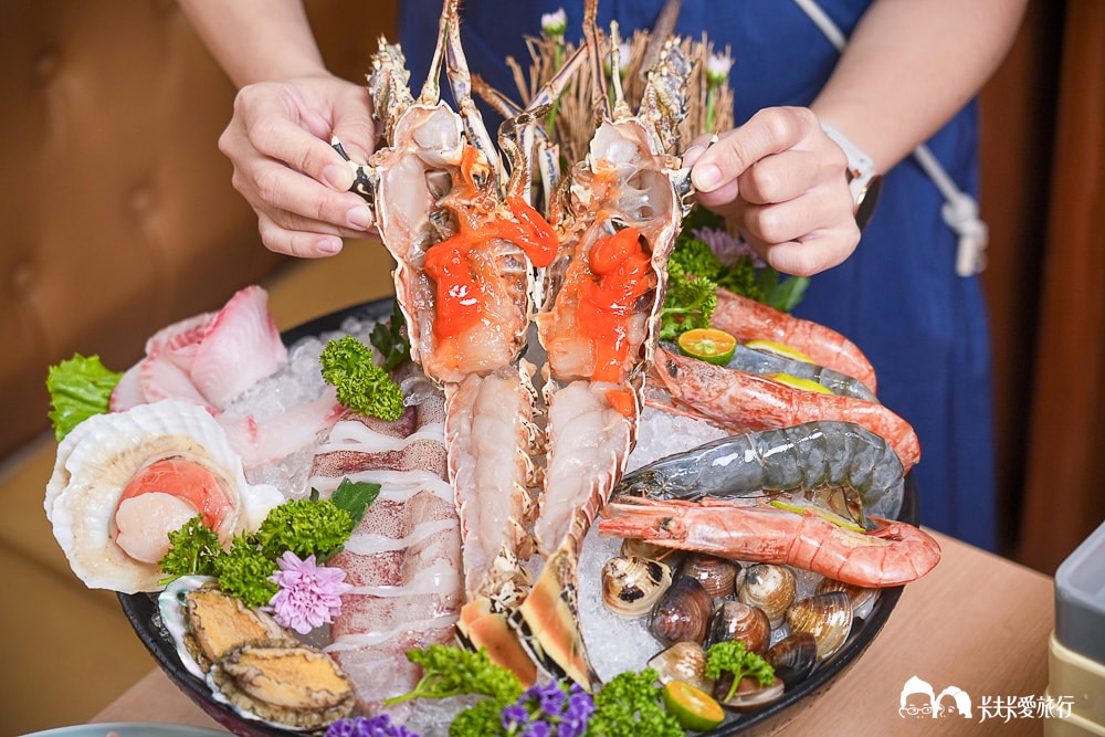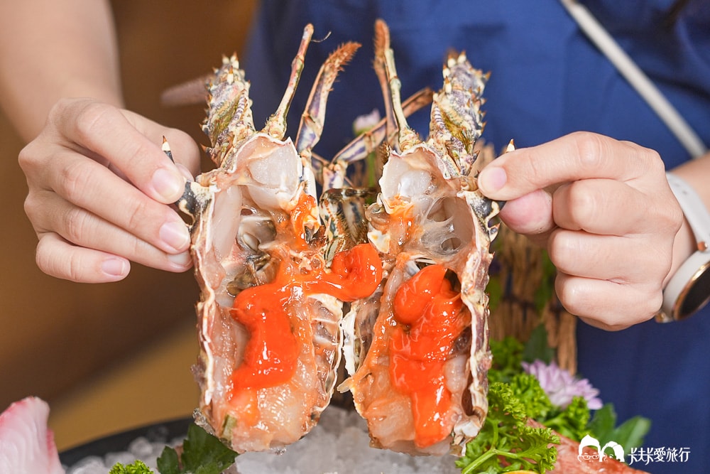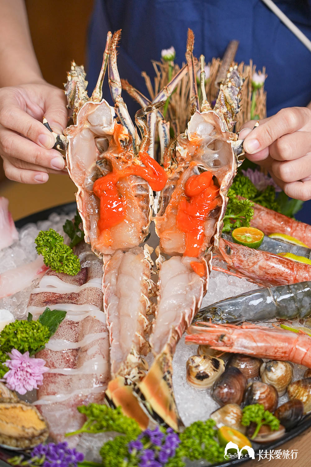 整盤龍蝦、鮮蝦、魚片、蛤蜊通通裝滿冰塊上桌,澎湃到讓人第一眼就想拍照打卡,這份拼盤不僅份量大,擺盤也相當講究,龍蝦切開紅通通的蝦膏看了就食指大動,海味十足
