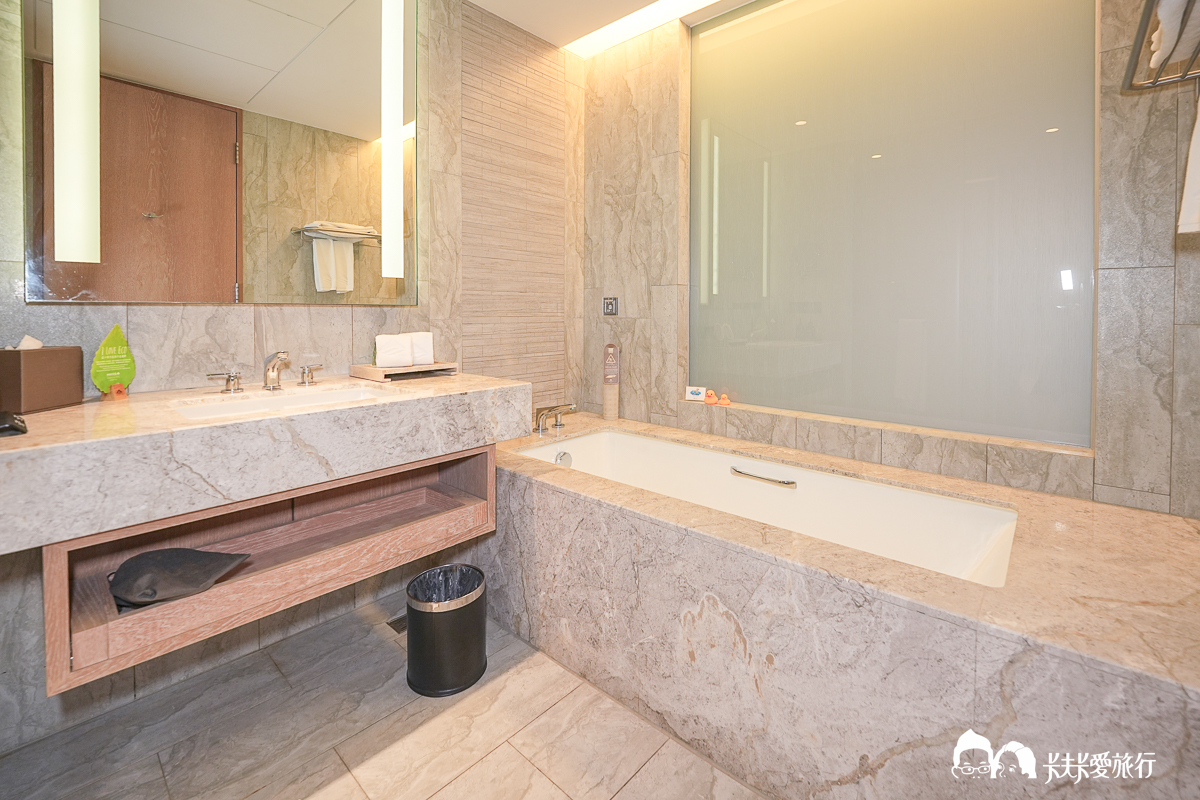 衛浴空間乾淨明亮,有浴缸、免治馬桶以及乾濕分離淋浴間