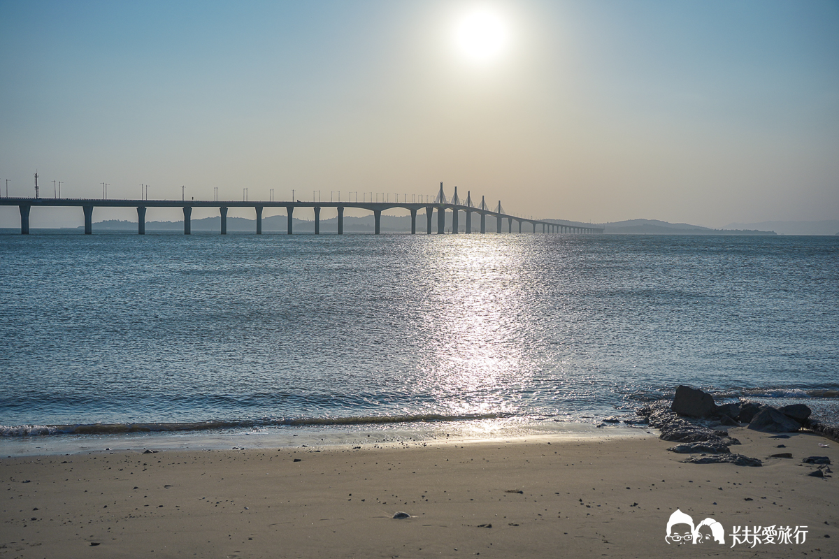 在「湖下海堤」看夕陽是金門最浪漫的行程之一,可以清晰地看到金門大橋,在沙灘上散步、吹風真的再舒服不過了