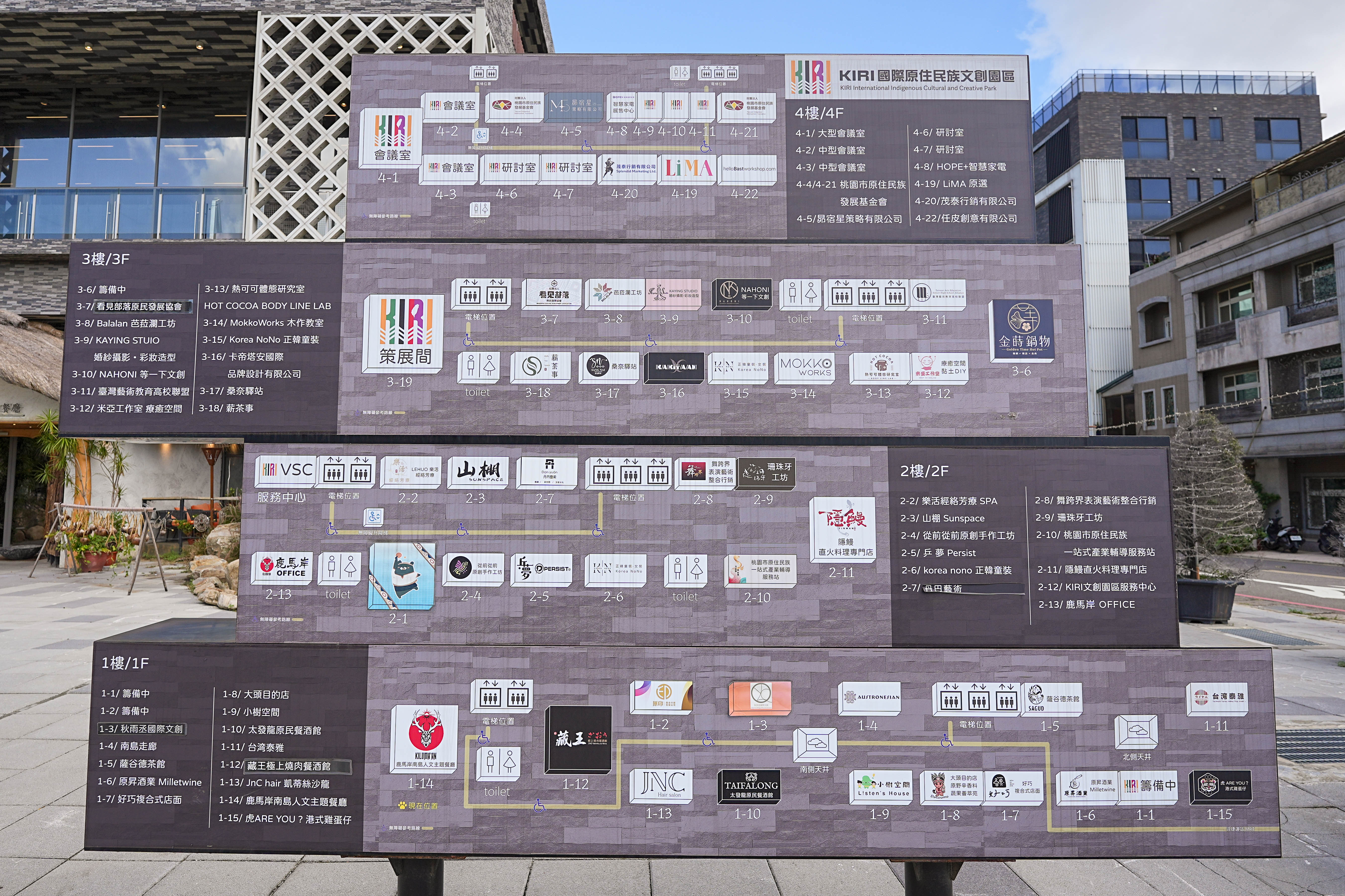 KIRI 國際原住民族文創園區,整個園區共有四層,一樓聚集輕食、飲品與文創店家如秋雨丞、薩谷德茗茶、大頭目的店、 台灣泰雅等(我的愛店),二樓以展售與手作工坊為主,三樓有Nahoni等創意品牌與體驗課程,下面樓層圖與店家資訊都可以點開看大圖喔
