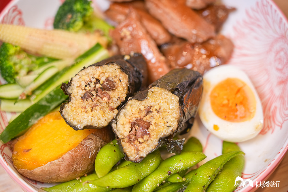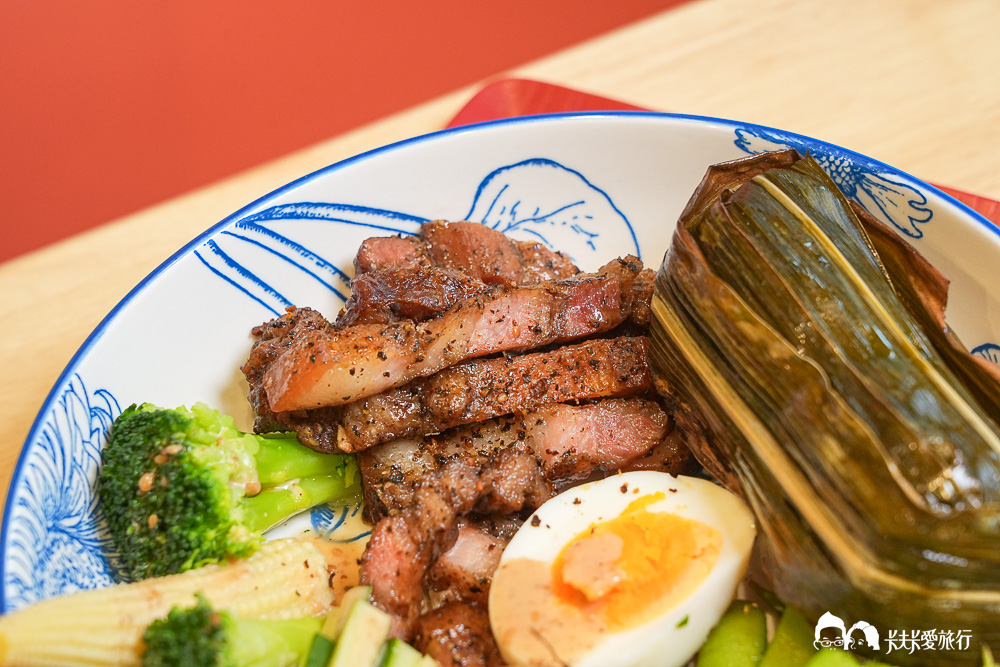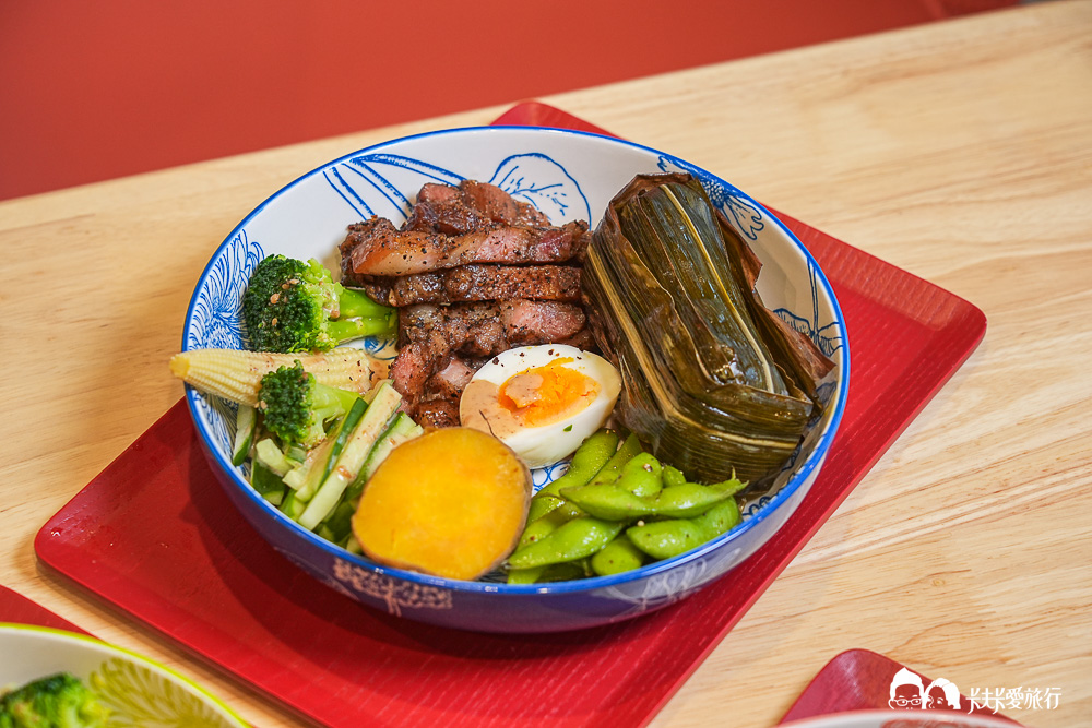 鹽豬肉烤得油亮,外層微脆、裡面多汁,帶著淡淡煙香,配菜有毛豆、地瓜、半熟蛋、爽脆蔬菜,營養滿滿又不膩口ㄊ