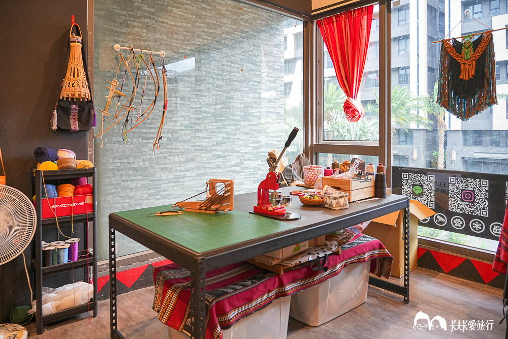 牆面上展示著充滿部落色彩的編織小包、流蘇吊飾、織帶作品,鮮豔的色彩和自然材質搭在一起,看起來特別有生命力,旁邊的桌面上則放著軟陶配件、繩結材料、小木片,各種 DIY 所需的工具