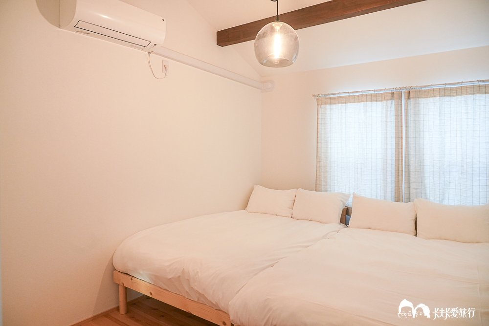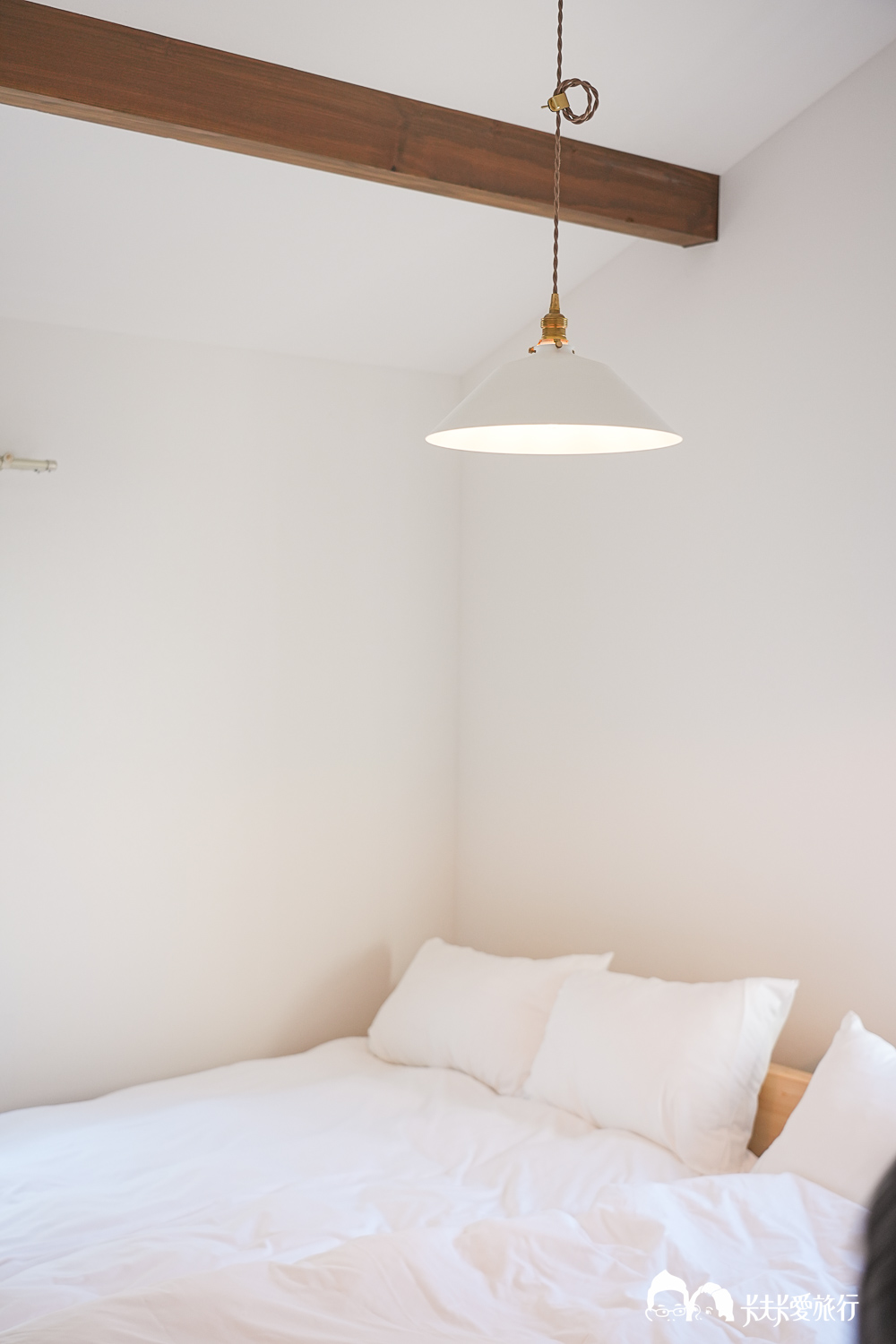 B Room 是二樓中間的一間,柔白的牆面與木地板交織成乾淨的空氣感,床舖寬敞柔軟,沒有多餘裝飾,卻有讓人一踏進就想深呼吸的寧靜