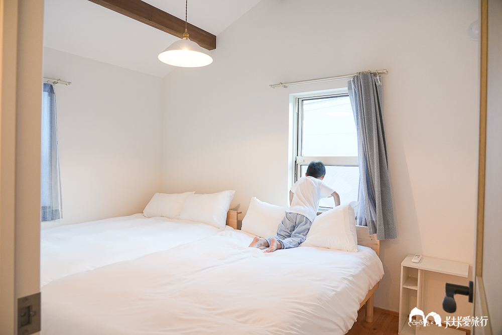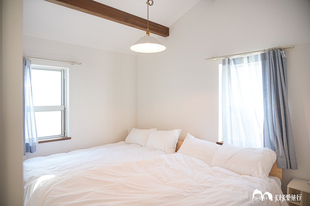 臥室部分都在二樓,總共有三間四人房,每一間都延續了「木光煦日」的簡約風格,純白牆面、木質點綴與對外窗的柔和光線,構成了最舒服的睡眠空間