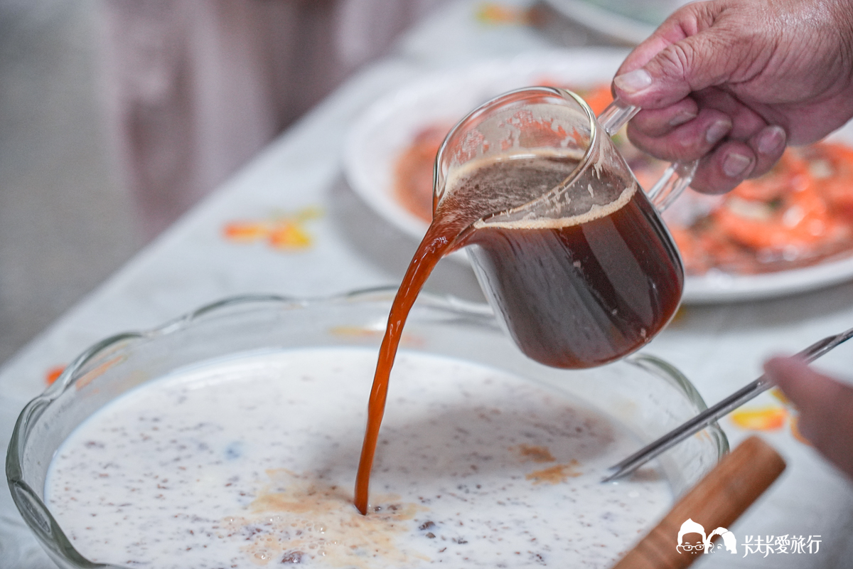 接著就來到隔壁的草店社區發展協會活動中心,第一次認識什麼叫做「藕咖奶」,顧名思義就是一款結合蓮藕、咖啡、牛奶的創意飲品,將蓮藕粉放入杯中,用熱水沖開並攪拌均勻,讓藕粉充分糊化,呈現滑稠狀,我個人覺得吃起來有點西米露的口感