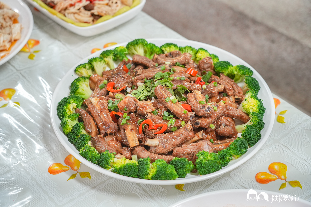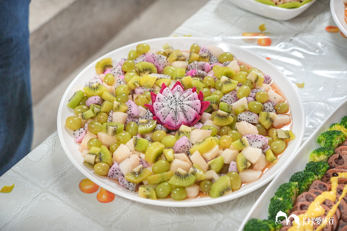 飲品準備好了就來吃午餐啦!草店社區的鄉村風味餐菜色超澎派,每道都色香味俱全,連水果都是蓮花造型的