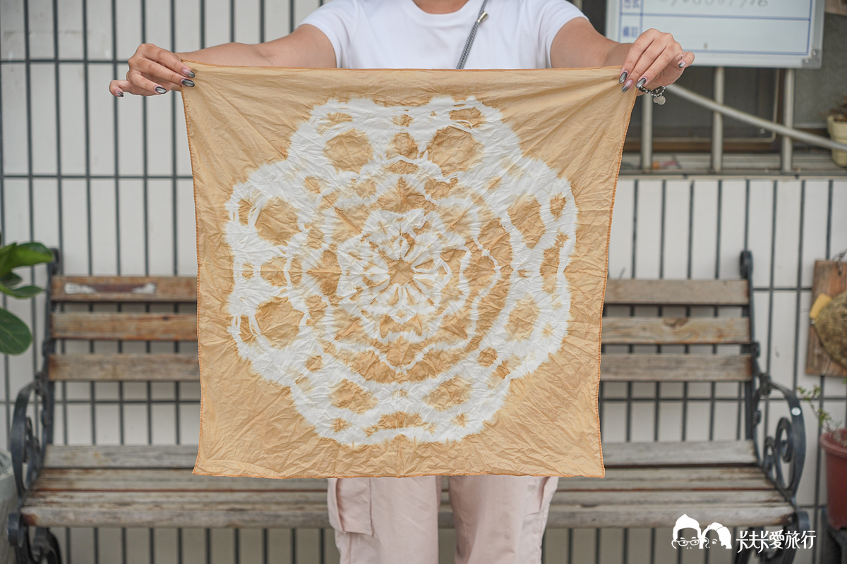 最後把染布上的橡皮筋剪開後曬乾,圖案就會對稱的展開啦!將專屬的自然圖案帶回家,作為最有溫度的紀念品