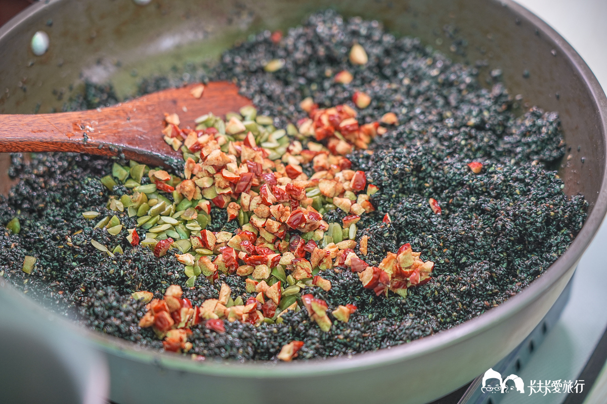 還看到了現炒黑芝麻球,加入紅棗碎、南瓜子以及枸杞下去拌炒