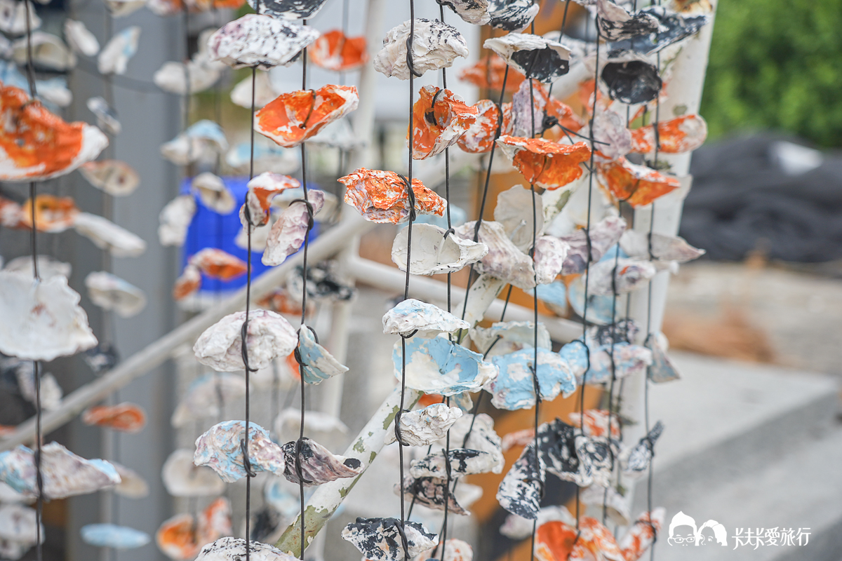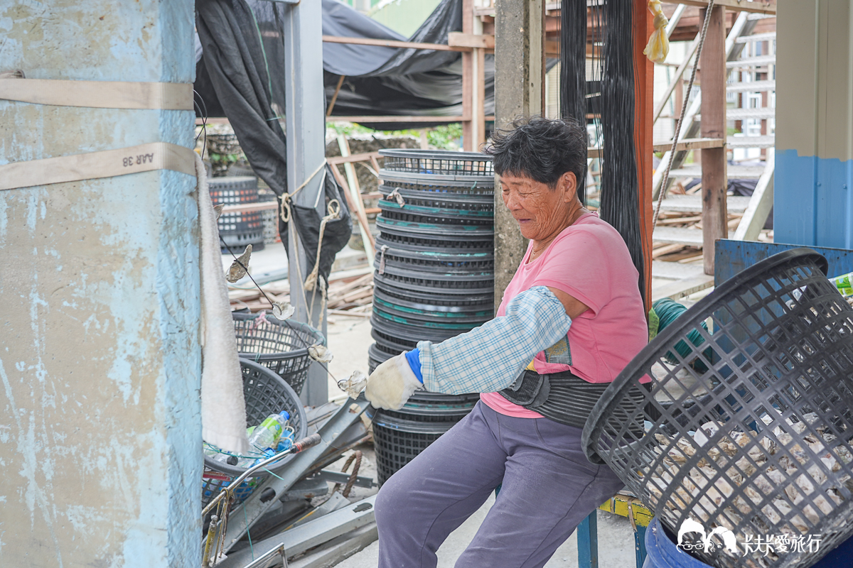 再走幾步看到阿嬤在專心將蚵殼綁成蚵串,動作非常俐落!