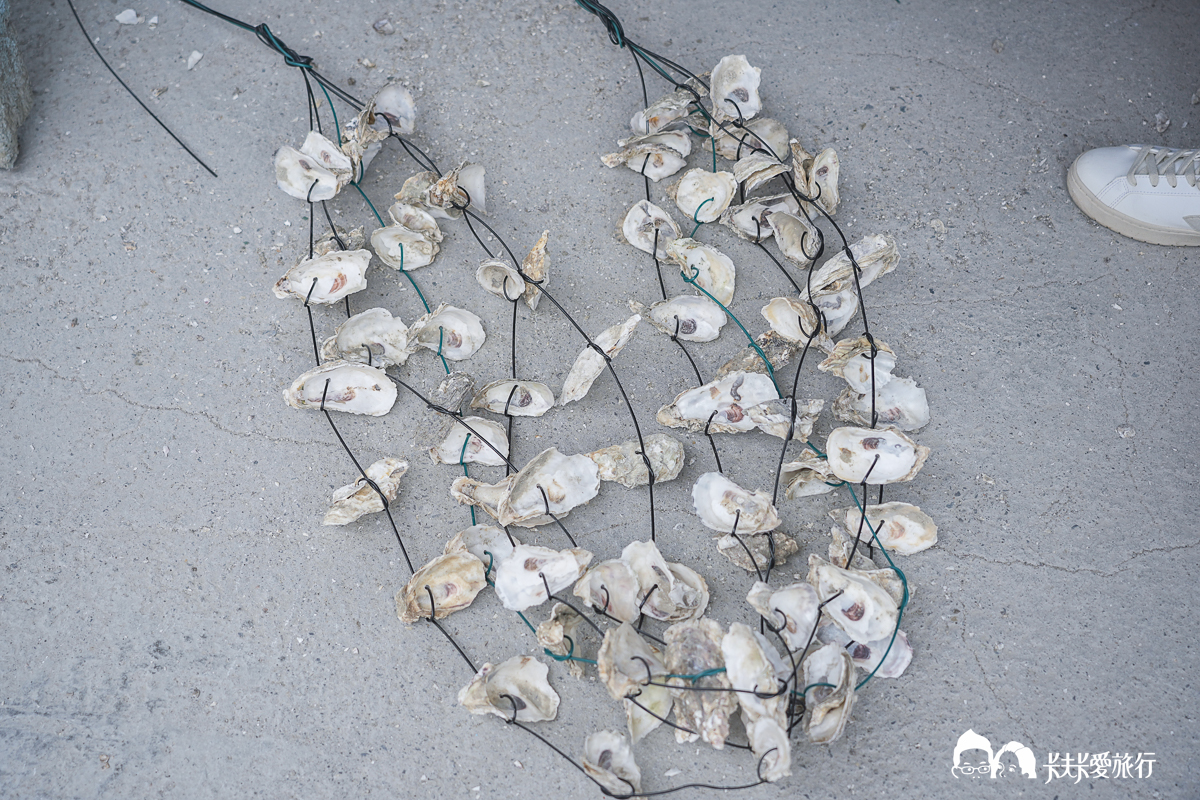 接著進入我們今天的重頭戲,一日蚵農體驗!前面有看到阿嬤在製作蚵串,為的就是把蚵串放在海水中讓蚵苗附著在蚵殼上,蚵仔會濾食海水中的微細藻類和其他營養物質長大,是不是超酷的呢?